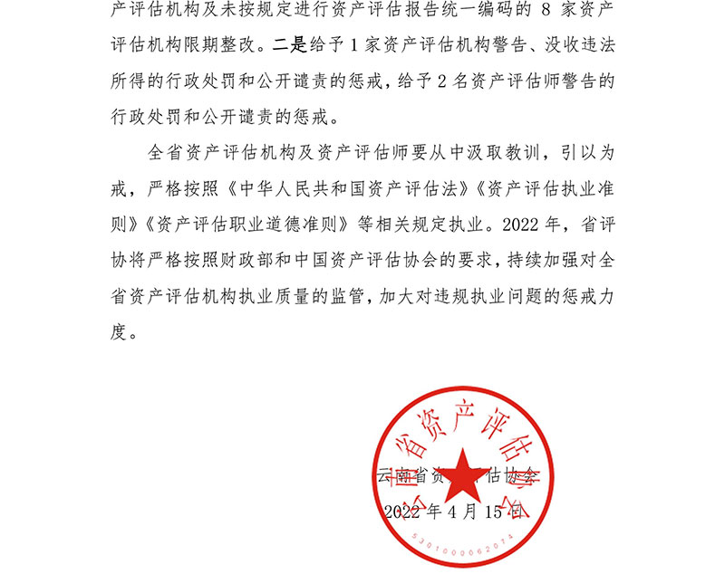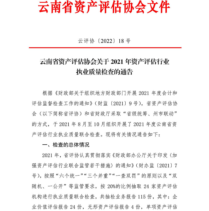 云南省資產(chǎn)評估協(xié)會關(guān)于2021年資產(chǎn)評估行業(yè)執(zhí)業(yè)質(zhì)量檢查的通告